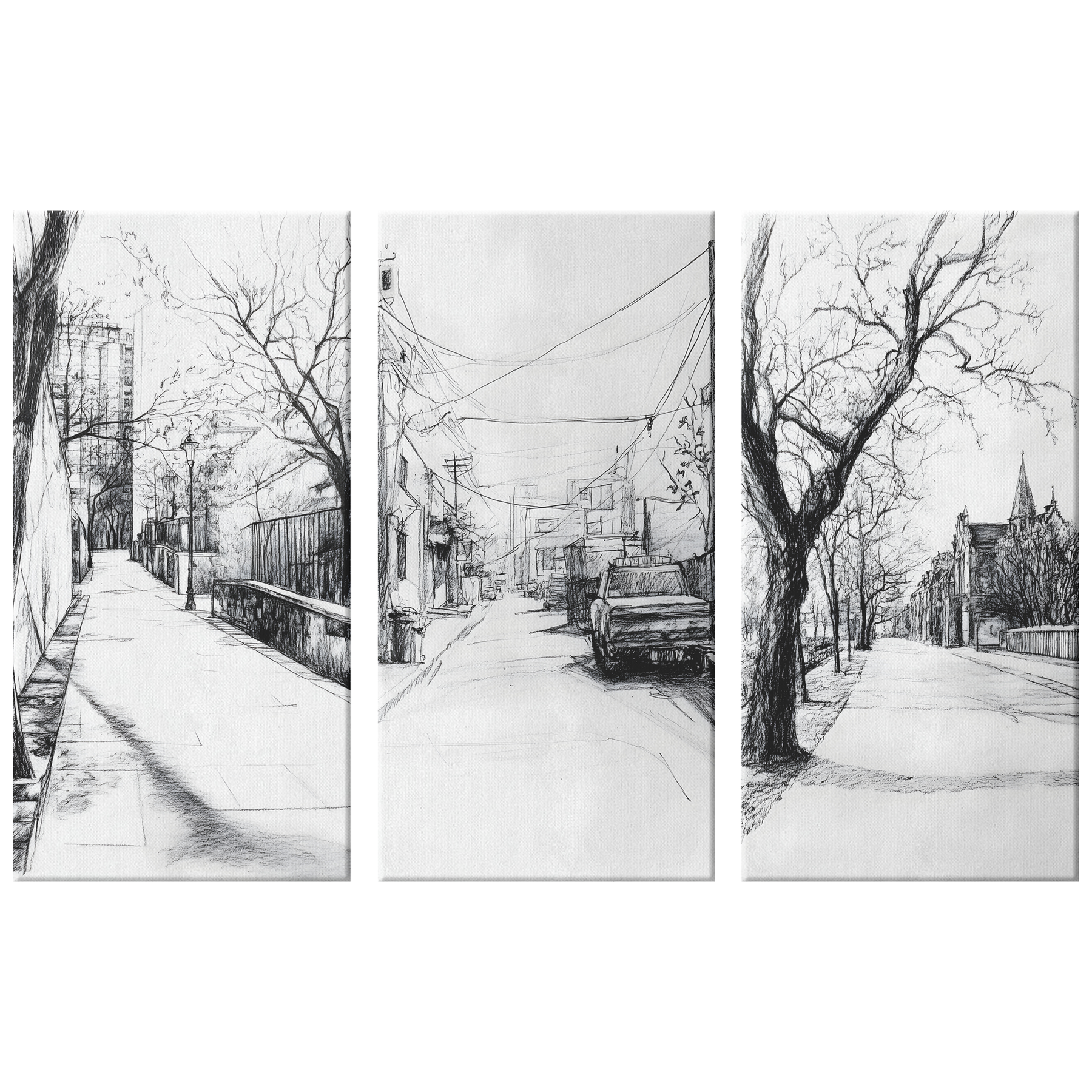 🖼️ Elevate your room with this exquisite 3 Piece Canvas set, featuring a captivating charcoal sketch of urban street scenes. The artwork presents intricate street views with trees lining pathways, cars parked along the roads, and charming urban architecture. Styled in monochrome, this set is ideal for art enthusiasts and those who appreciate cityscapes.