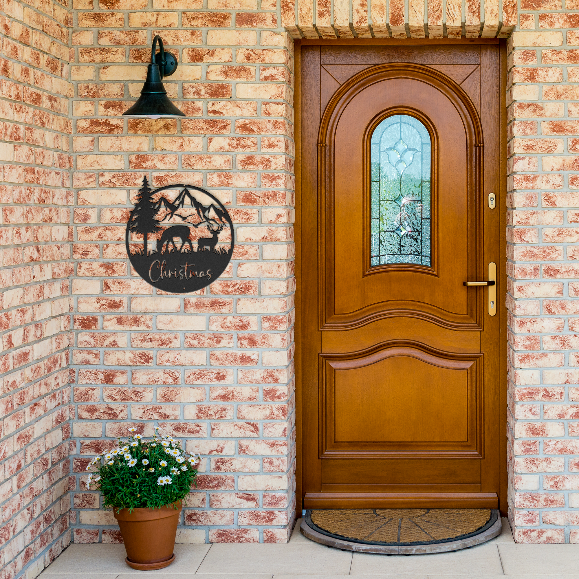 This striking black metal sign, displayed on a brick wall next to a charming wooden door, enhances your holiday decor by adding a sophisticated seasonal statement.