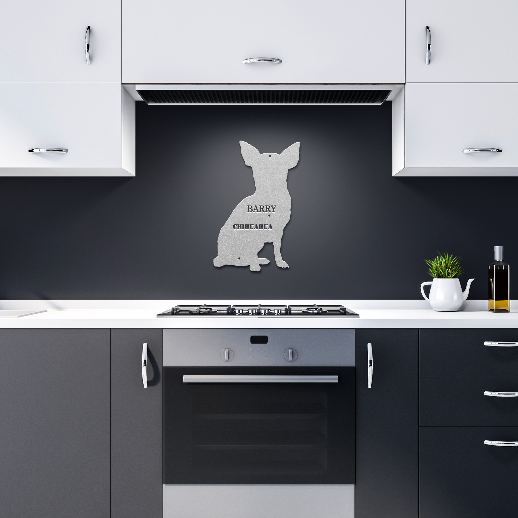 The decoration presents a charming silhouette of a chihuahua in black, embellished with the name 'Barry' and the word 'CHIHUAHUA' stylishly integrated into the design. Displayed against a sophisticated living room wall, it adds a refined and personal touch.