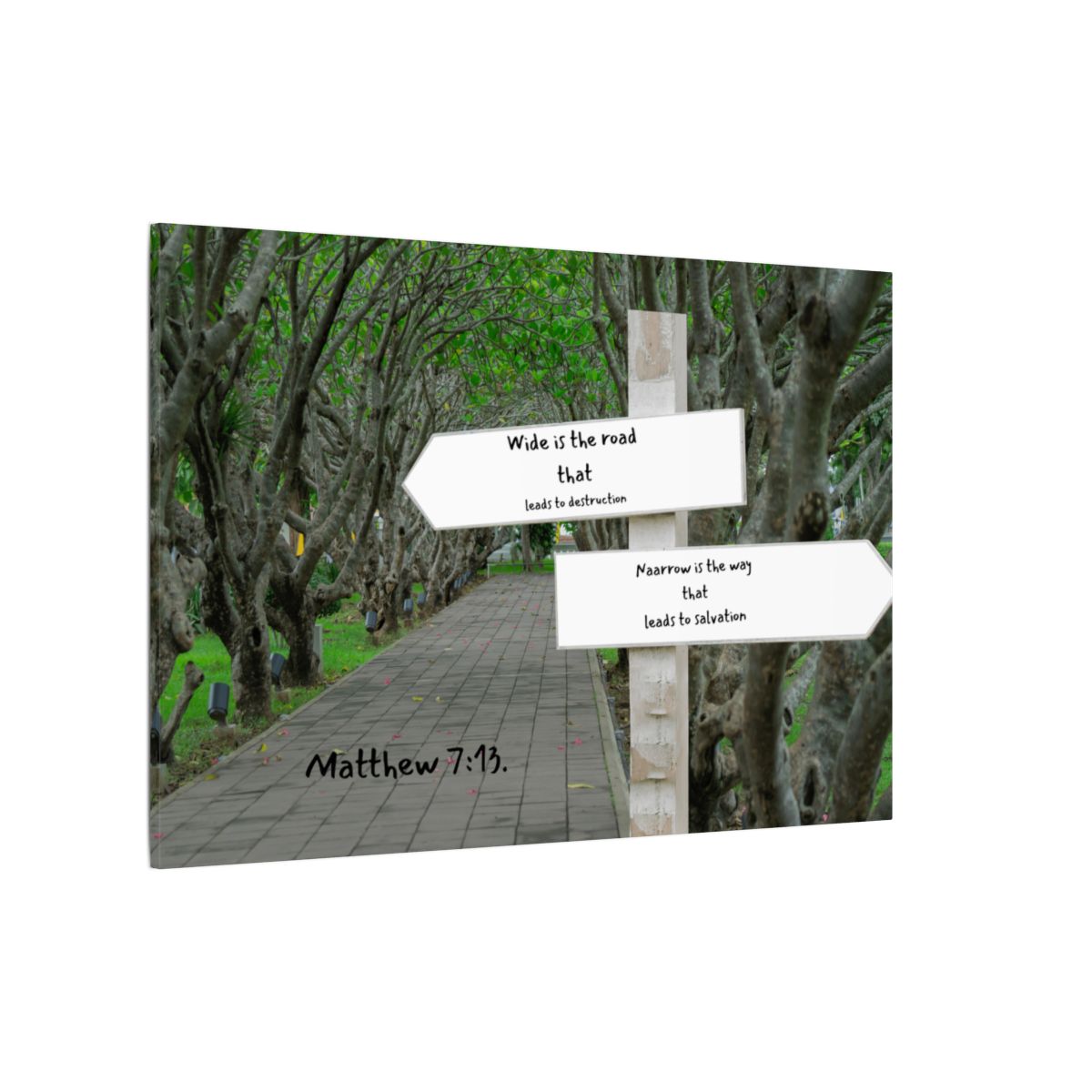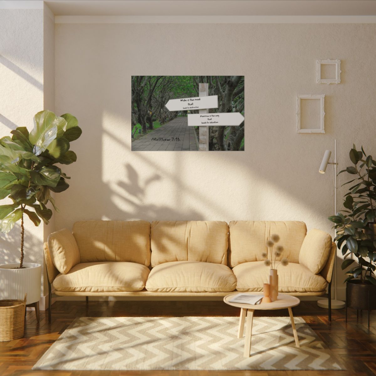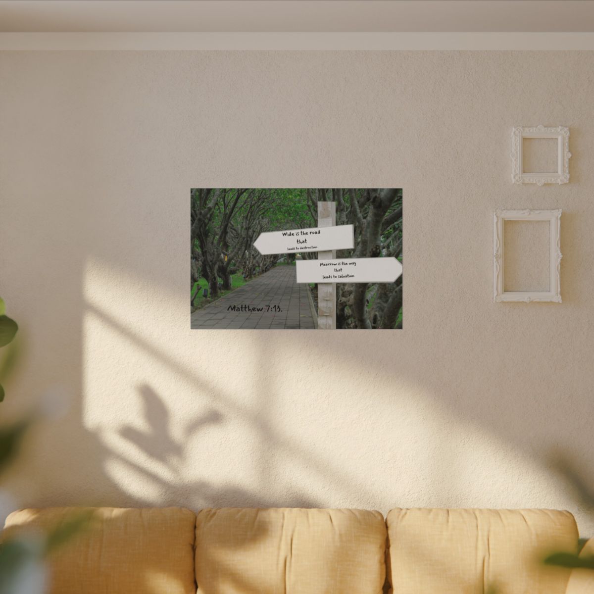 This visually captivating canvas features a serene outdoor path lined with lush, textured trees, creating a tranquil and inviting scene. A white directional sign, artfully placed in the image, adds an element of thoughtful journey and calm contemplation.