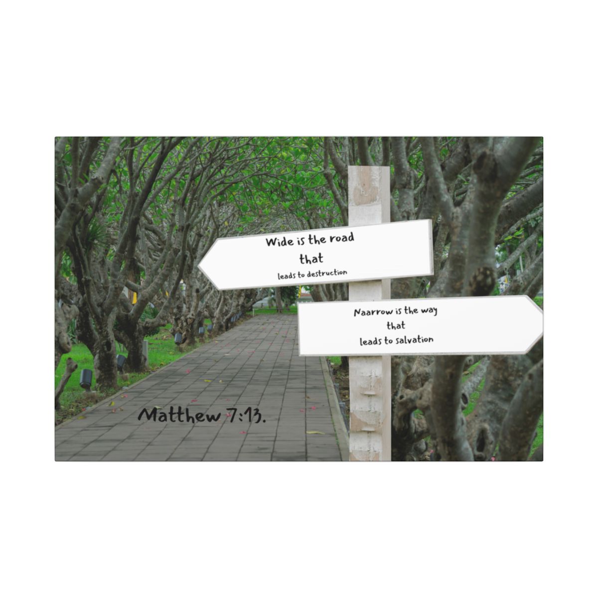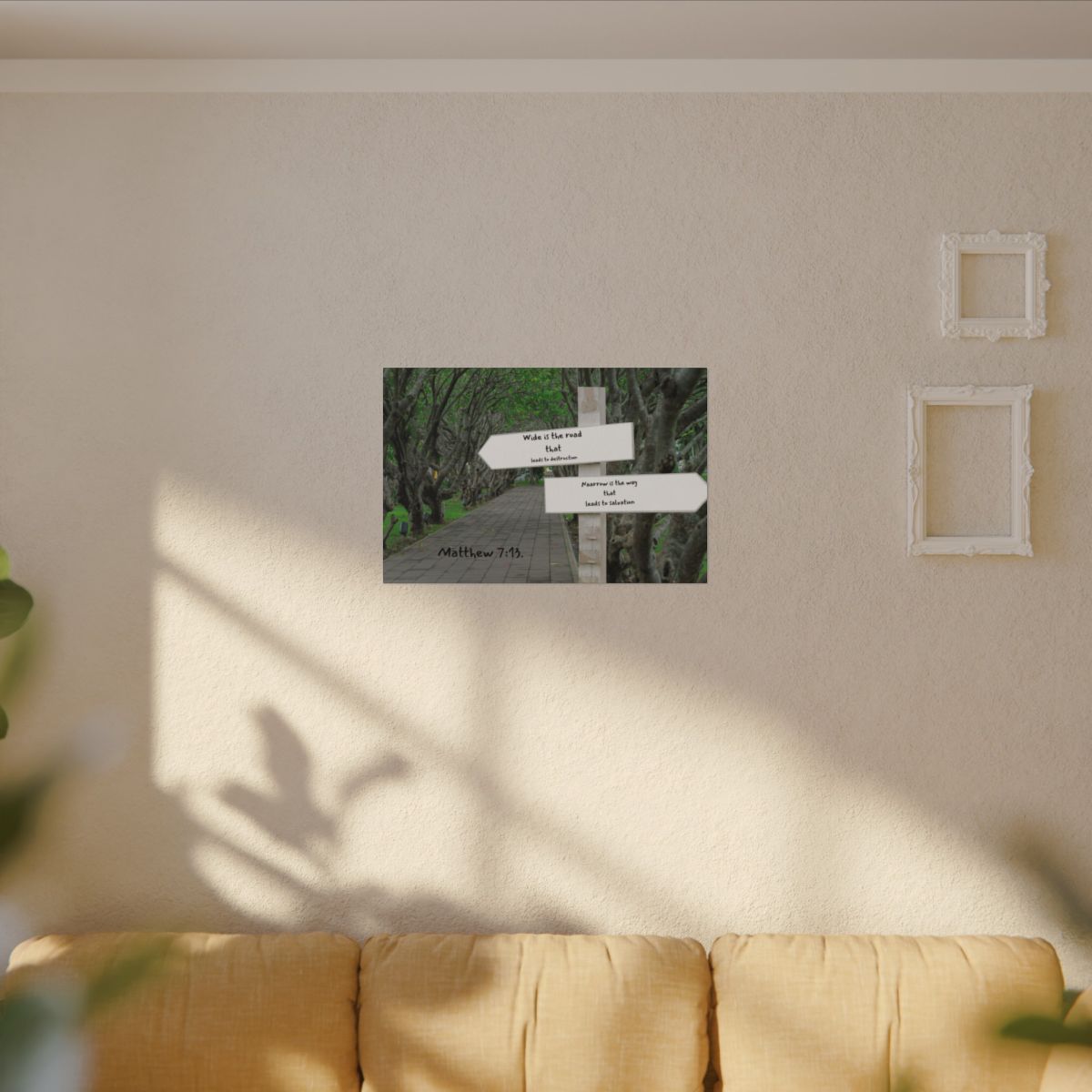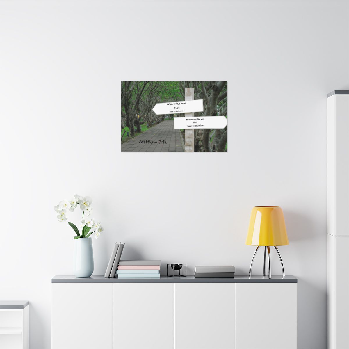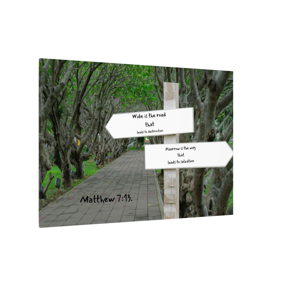 This visually captivating canvas features a serene outdoor path lined with lush, textured trees, creating a tranquil and inviting scene. A white directional sign, artfully placed in the image, adds an element of thoughtful journey and calm contemplation.